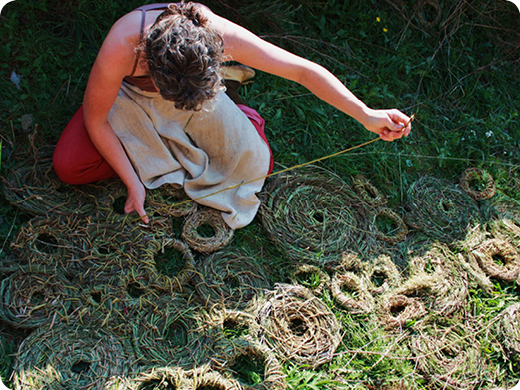 With a "one mile diet" approach to sourcing art materials, Sharon Kallis works to discover the inherent material potential in a local landscape. Participating families will work together making a large quilt-like pattern on the ground, using birdseeds and flower petals as the palette.