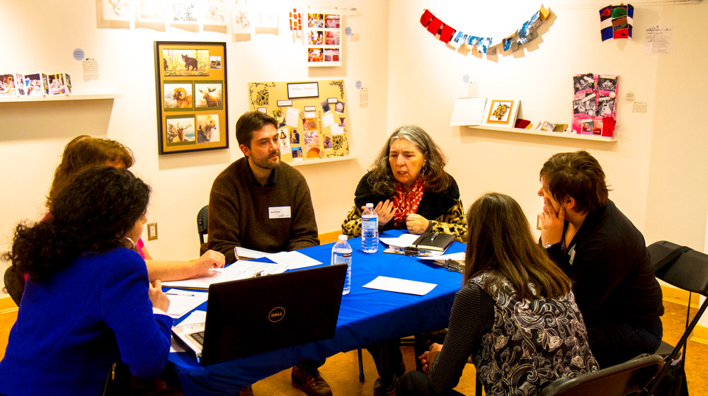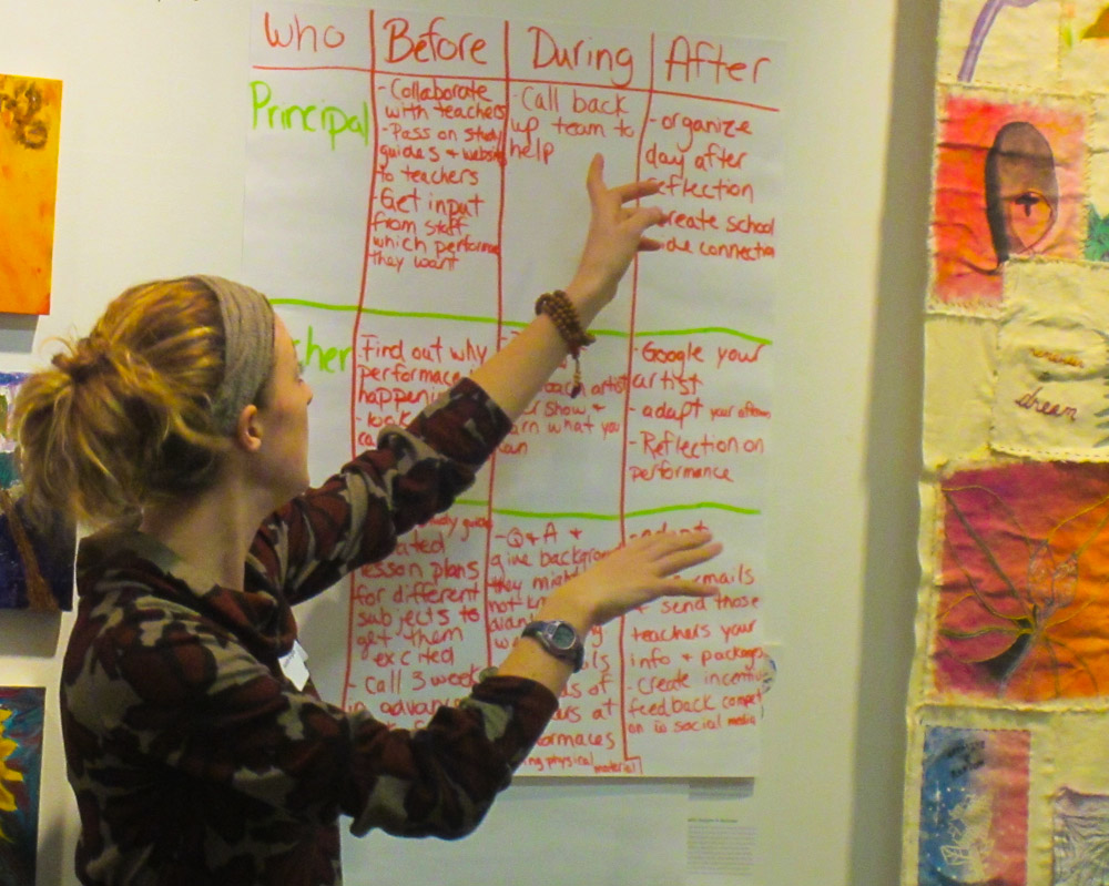 We enjoyed several large group discussions, which included various topics, from outlining strategies for turning schools and community centers into galleries and exhibition spaces, to sharing what can be done before, during and after interactions between artists and schools to maximize the experience for all.