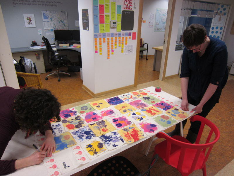Jacquie helps label artwork created by a group of young artists during a tour of the ArtStarts Gallery